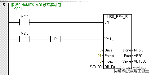 以下的程序段读取SINAMICSV20实际频率(参数r0021)。由于此参数是一个实数,因此选用实数型参数读功能块。
