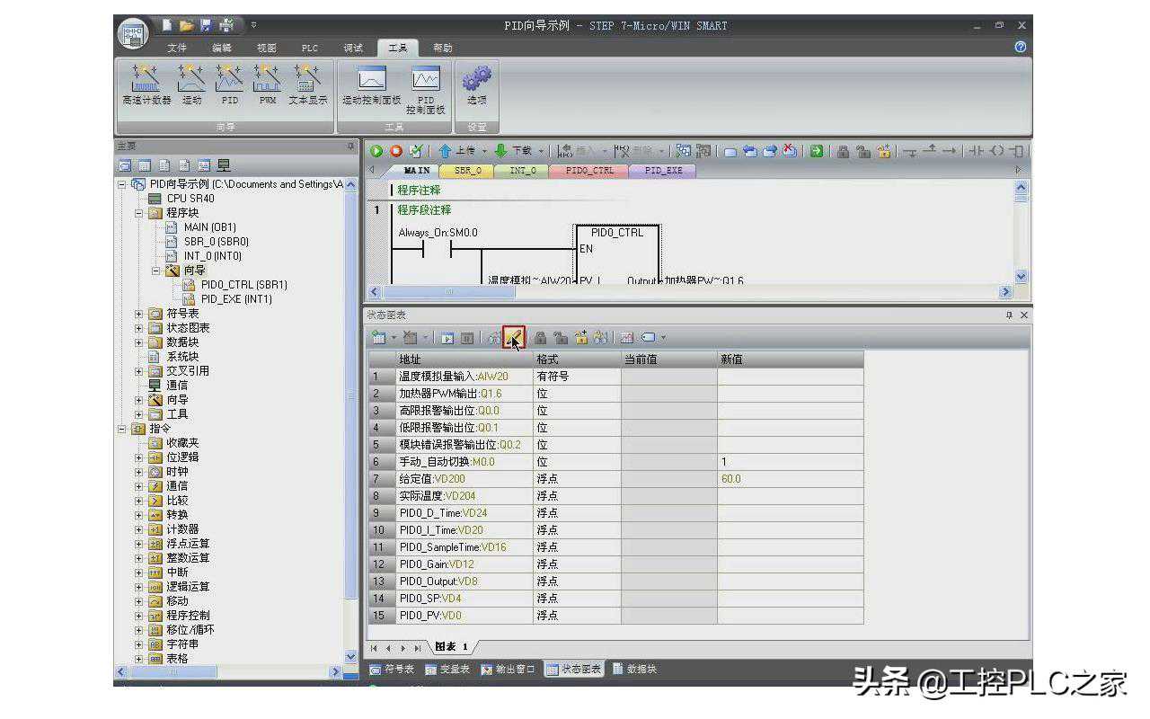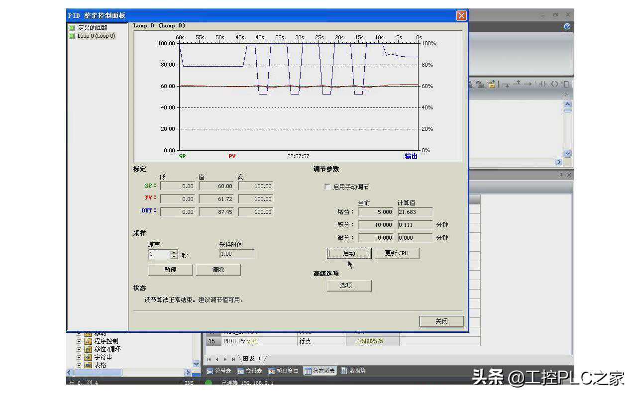 自整定。要使用PID控制面板必须与CPU通信,用PID向导配置生成一个PID回路,并将程序下载到CPU中,使CPU处于运行模式,在状态图表中将给定值设为60度,PID控制改为自动模式。