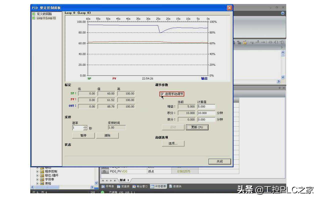 在工具菜单功能区单击PID控制面板按钮,打开PID整定控制面板对话框,选择回路0,先启动手动调节,输入PID参数,如增益改为5.0,单击更新CPU,使新输入的参数值起作用,监视趋势图,根据调节状况改变PID参数直至调节稳定,即过程值与设定值接近,且输出没有不规律的变化,并最好处于控制范围中心附近,此时可将手动调节改为自动调节,即自整定。