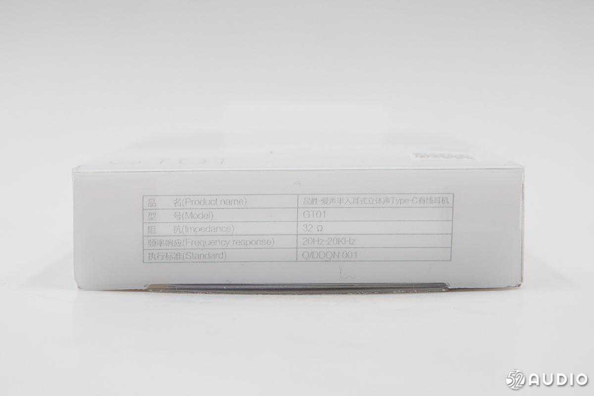 底面是一些参数,品名:品胜-爱声半入耳式立体声Type-C有线耳机,型号:GT01,阻抗:32Ω,频率响应:20Hz-20kHz。