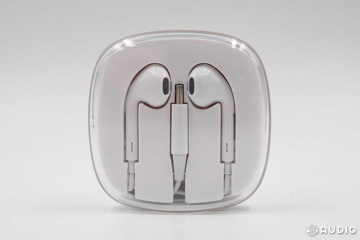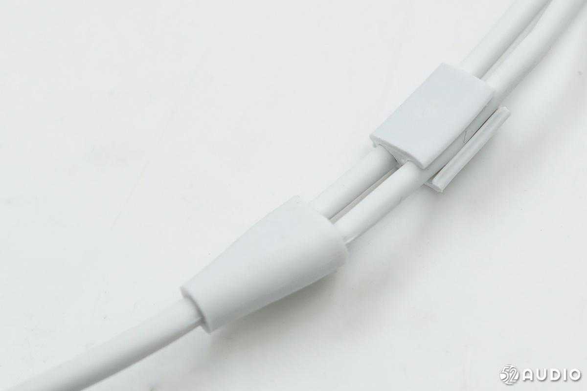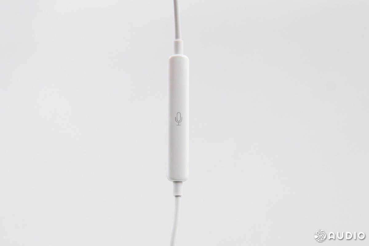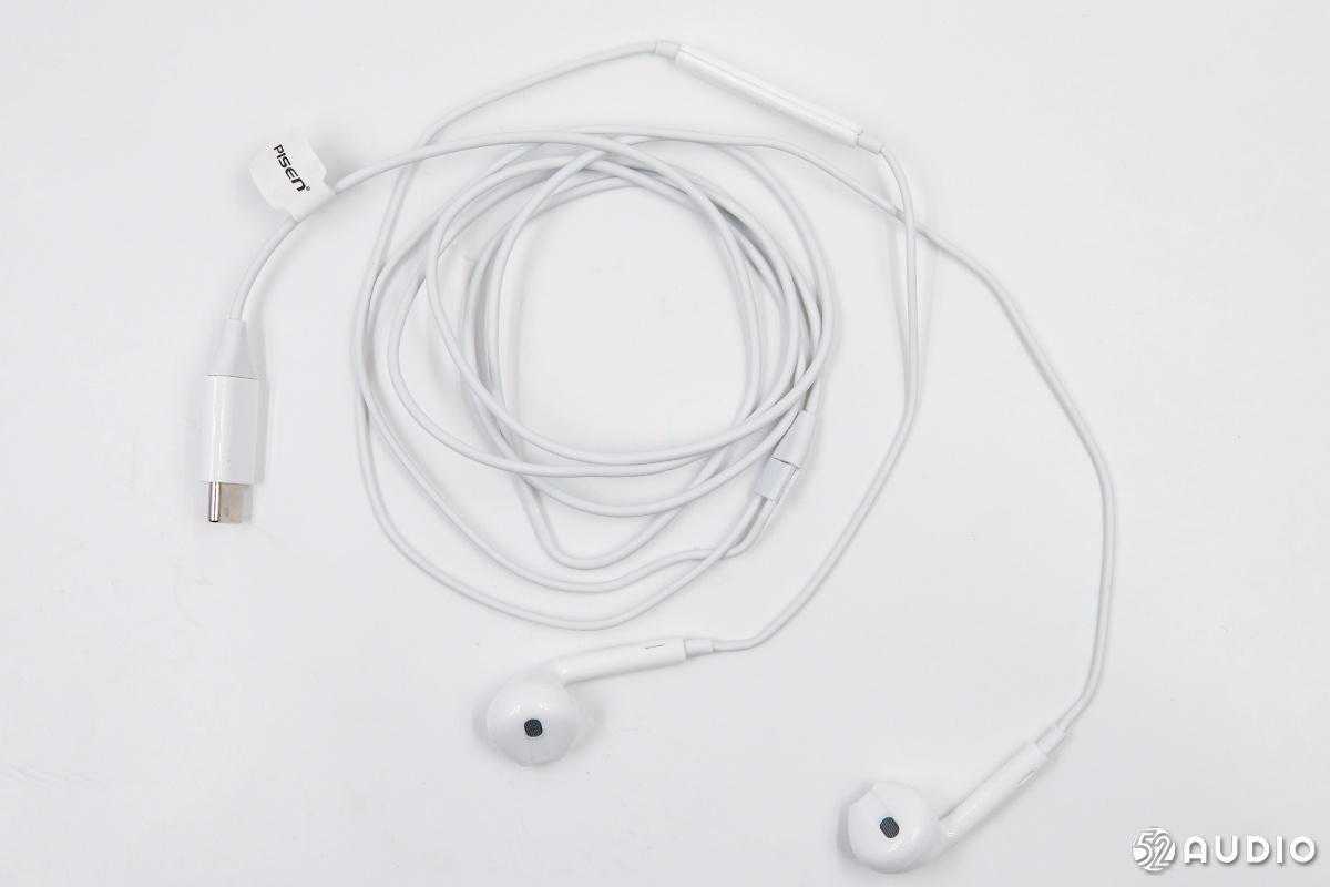 耳机采用白色线材,一端为USB-C接口,中间是线控,另一端是两只耳机。