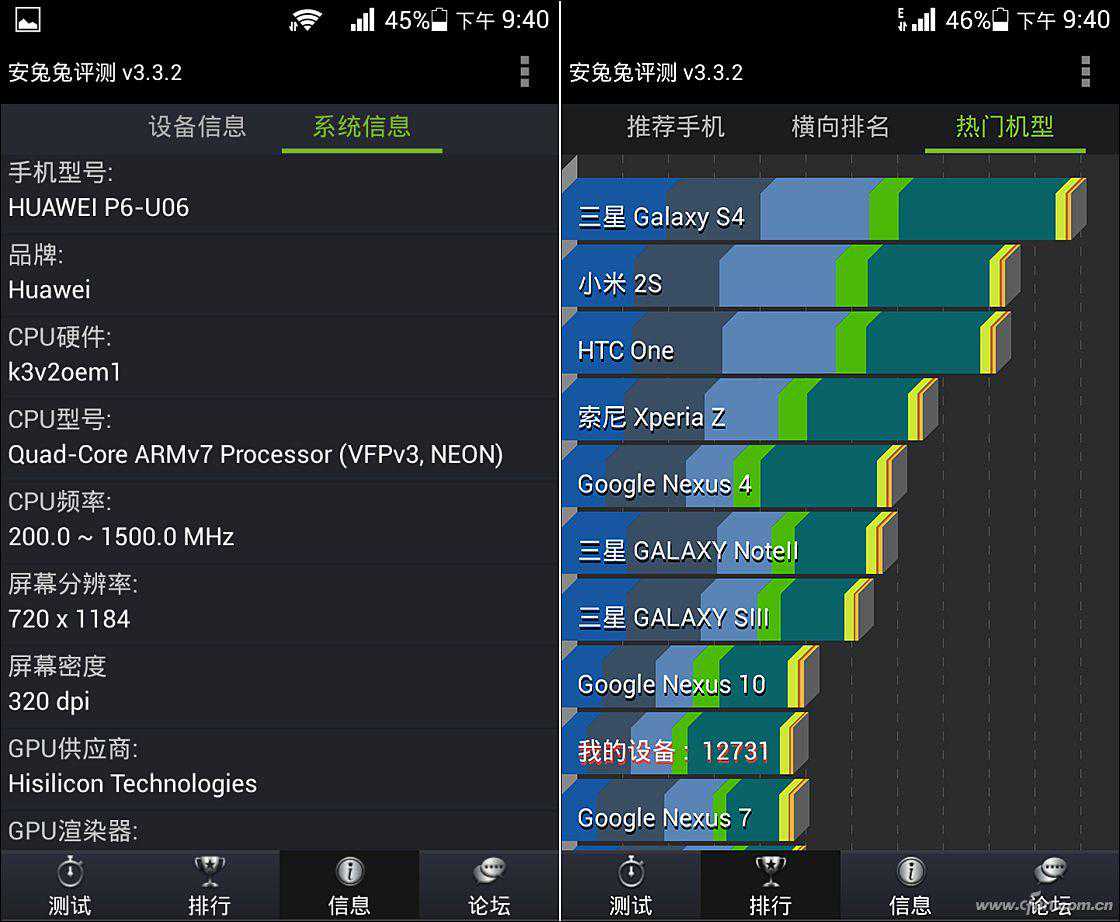 AscP6与同期高端手机的安兔兔跑分对比