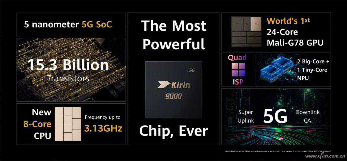 2020年10月22日,海思麒麟9000系列正式降临,得益于当时世界最先进的5nm制程工艺,使其成为了世界上第一颗晶体管数量超过150亿大关的移动终端芯片。由于麒麟9000集成了巴龙5000基带,所以也是全球第一颗、也是当年唯一一颗5nm工艺制造的5GSoC(苹果A14外挂基带,所以不满足5GSoC的定义)。