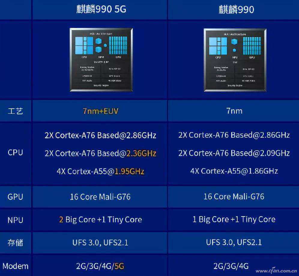 需要注意的是,与其一起发布的还有麒麟9904G标准版,差异是后者的工艺改为普通的7nm,主频有所降低,集成的NPU规模有所缩水,想支持5G需外挂巴龙5000芯片。