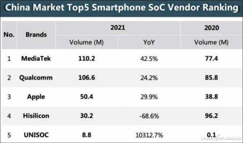 由于海思麒麟的暂时退出,让出的市场份额让联发科吃了个盆满钵溢。根据知名统计机构CINNOResearch公布的2021年中国智能手机市场SoC销量榜来看,联发科2021年以1.1亿颗的芯片,同比增长了42.5%,超过高通,成为了2021年中国手机芯片市场的大赢家。华为海思下滑了68.6%,相当于同比跌了三分之二,从2020年的9620万颗,变成了2021年的3030万颗,断崖式的下降令人唏嘘。随着麒麟芯片库存的告罄,未来海思的占有率