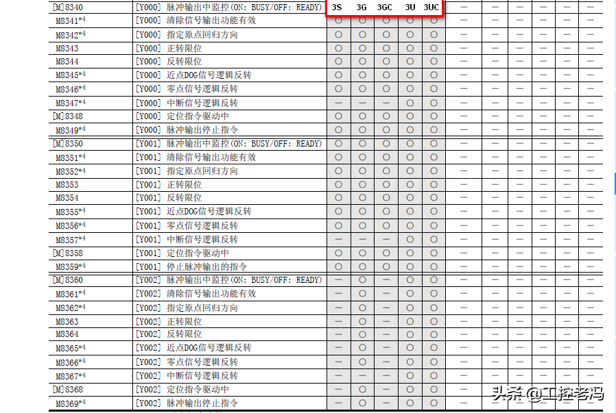 这也是单轴程序的用法。因为很多朋友怕程序里面出现多个M8029会出现误动作。我们今天暂且不讨论M8029是否会出现误动作。我们今天是要学习三轴联动到底怎么写。其实三菱PLC里面有很多关于运动控制的辅助继电器。这里老冯截取了FX3系列PLC的一部分特殊辅助继电器。