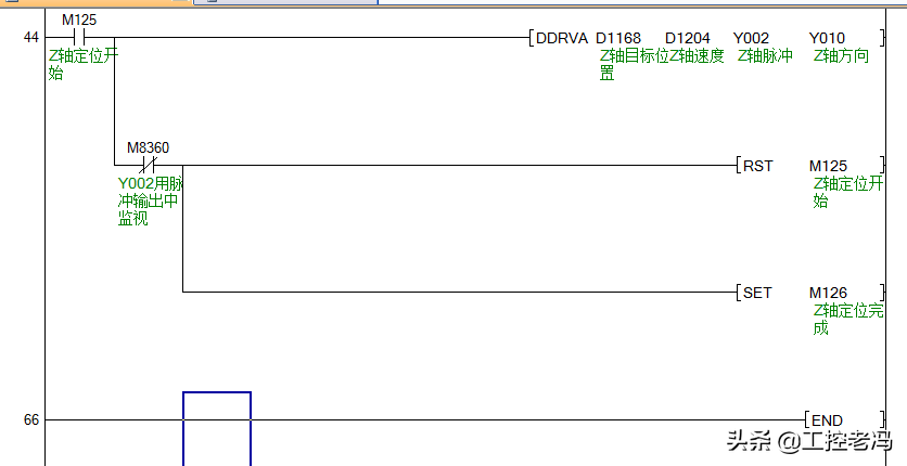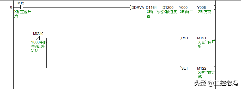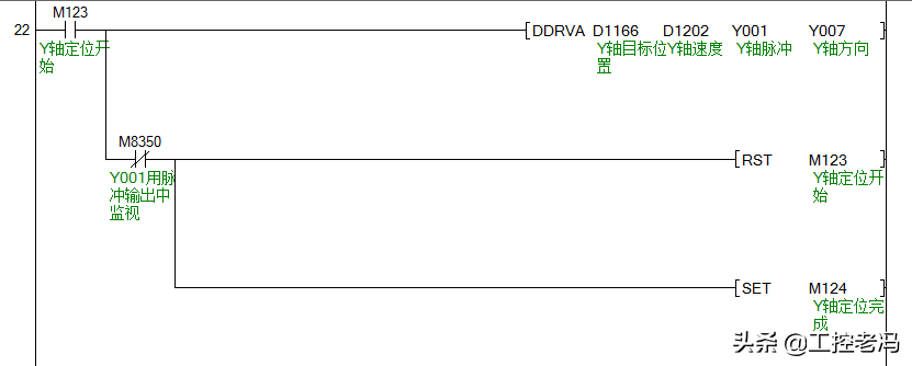 有了这三个辅助继电器,想写三轴联动的程序就简单了。下面是老冯随意写得一段程序样例。我们根本就不用M8029,所以没必要去死磕M8029。编程的思路有很多,换个思考方向就好了。