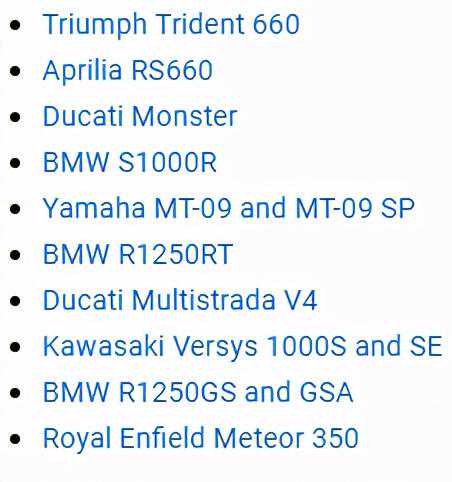 最新的RT配备了动态牵引力、“eco”驾驶模式、陡坡起步控制、定速巡航、加热把手、“全集成ABSPro”和10.25英寸彩色TFT仪表板,这是15820英镑的基本车型的标准配置。它的显示屏可以连接蓝牙,并内置导航功能,是所有摩托车上第一款可以卫星地图导航和路线规划的智能显示屏。