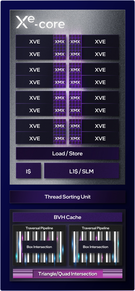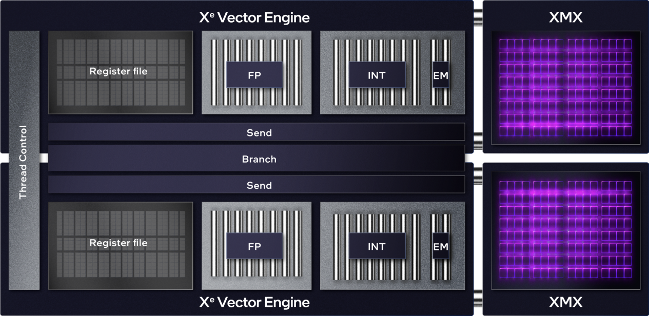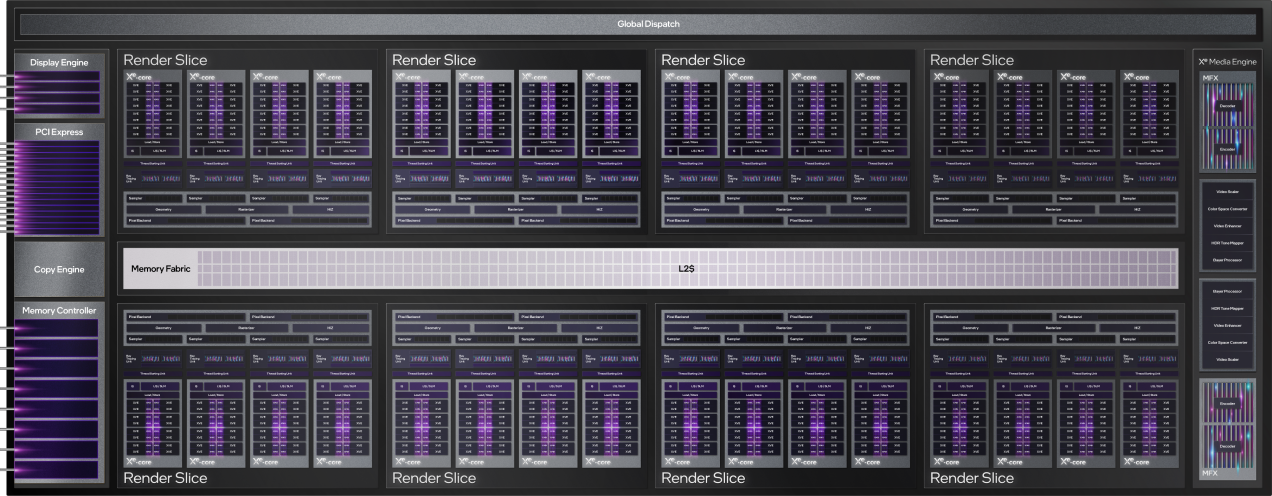 至于锐炫GPU的Xe-core的整体架构,大家可以看Intel提供的下面这张平面图。不同的锐炫GPU在运算单元数量上可能有所不同,但大体结构均是如此。