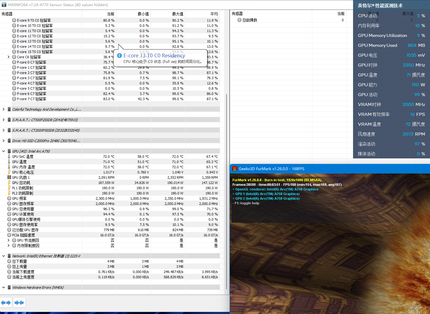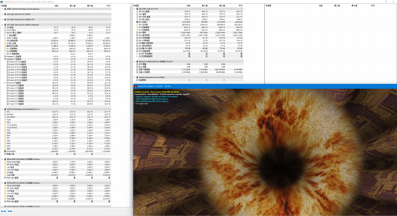 当然大家最关心的还是锐炫A770和A750的核心性能如何。因此我们接下来先进行一下压力测试。在烤机10分钟后,两张显卡都稳定在190W左右,温度也在72-74℃,非常接近。