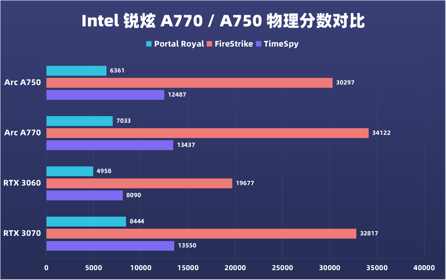 我们再进行3DMark的理论跑分,然后把它与同价位的甜品卡进行对比。令笔者惊讶的是,在发布会上intel一直在于RTX3060这款甜品卡对标,但实际上它的理论分数已经和RTX3070不相上下。而且与以往我们对“锐炫显卡DX12强势,DX11短板”的刻板印象不同,A770和A750的传统DX11性能也并不差。