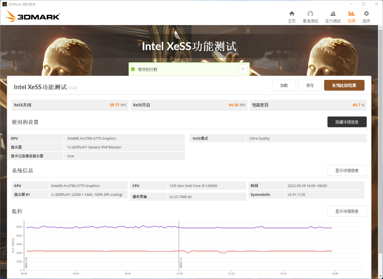 此外,现在3DMark还提供了XeSS的BenchMark。从中我们能直观的看出XeSS对游戏帧数巨大的提升。