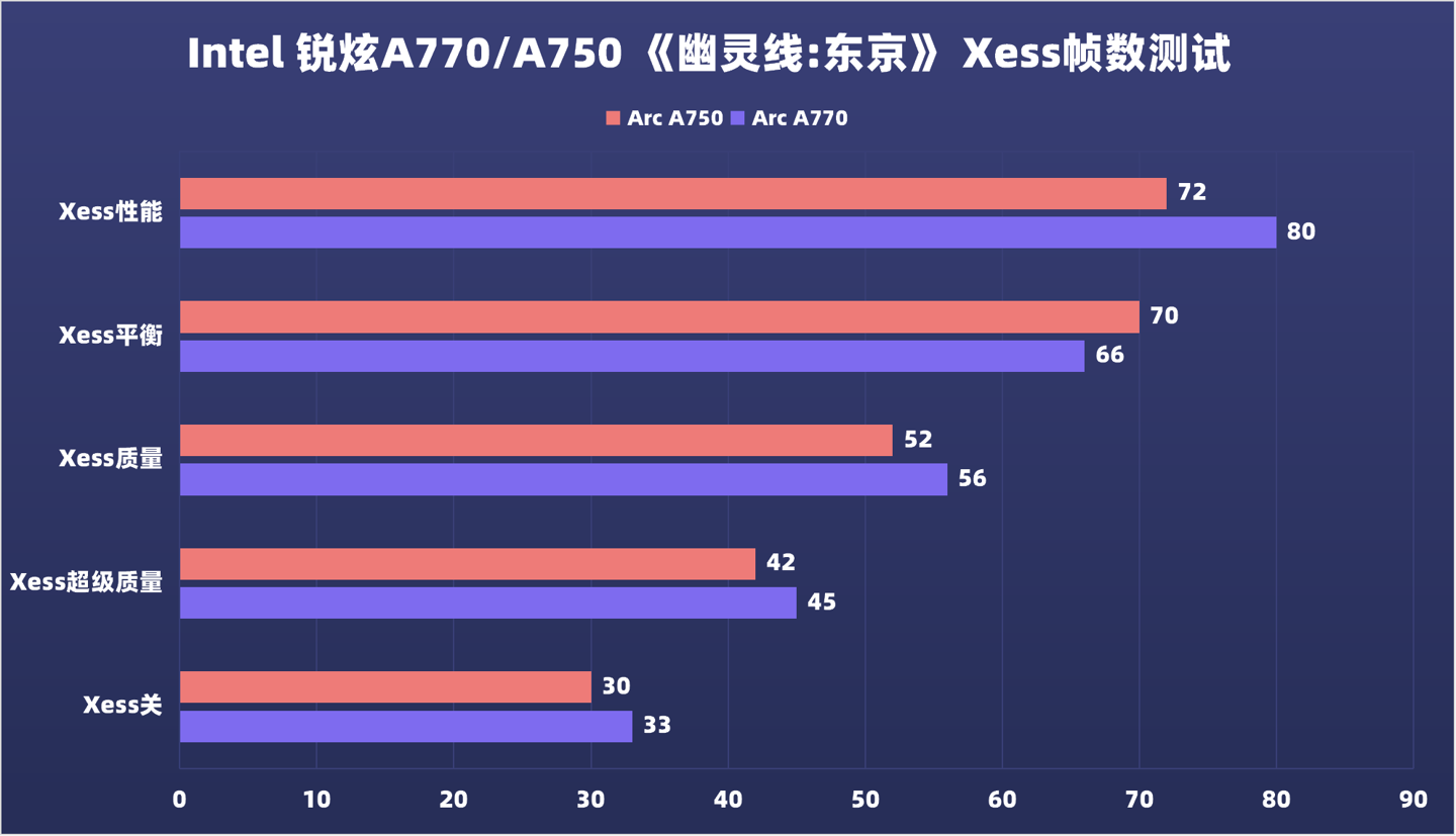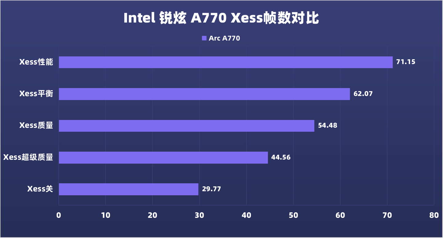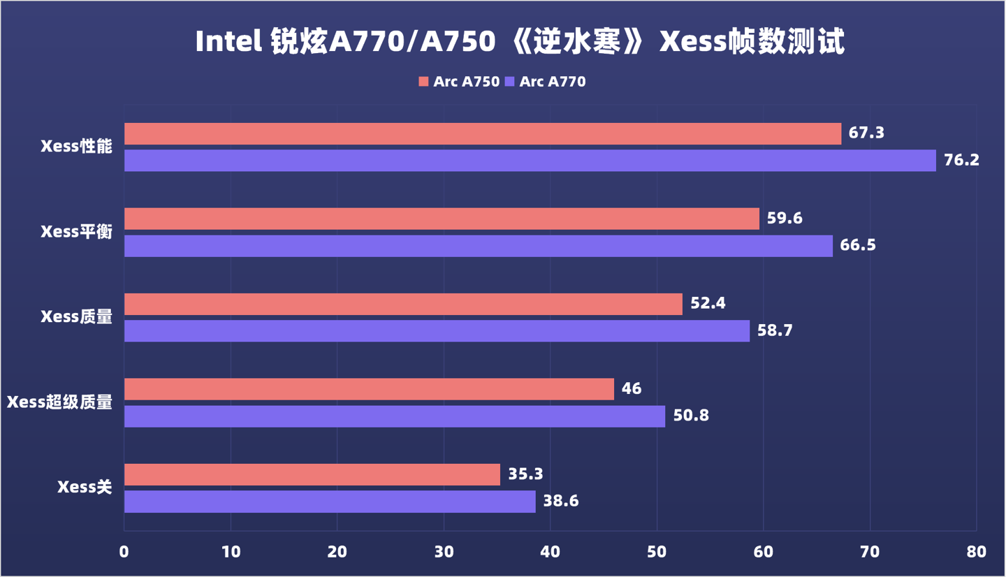 在不开启XeSS时,A770和A750出色的光栅性能已经能满足2K高画质流畅游玩,而在开启XeSS后,帧数也有了一定的增长,不过增长幅度不如上述游戏明显。