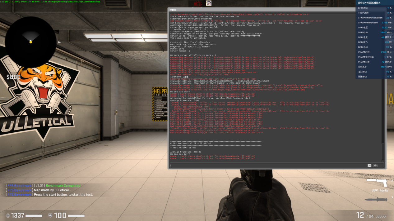 看来在XeSS的帮助下,A770和A750能轻松实现帧率暴涨的效果。那么在不支持XeSS的传统游戏中,它们的光栅性能能否经得住考验呢?我们接下来先测试一下《CS:GO》的BenchMark,实测A770帧数达到了268,A750达到了258,都是非常流畅的。