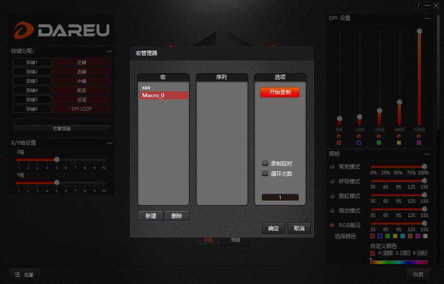 达尔优A970牛年特别版提供了官方驱动程序,在官网下载后解压安装即可。在驱动中,我们可以看到各种设置,在左上角区域,我们可以看到按键分配区域,这款鼠标拥有六个可独立变成按键,通过驱动即可轻松设置需要组合的按键功能。左下侧则是XY轴速度设置。右侧可设置的是DPI和灯光模式,可以轻松自定义。