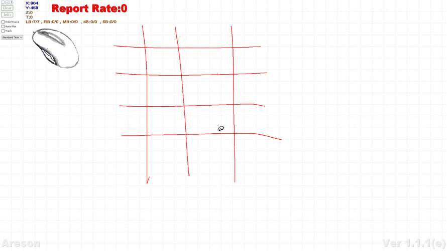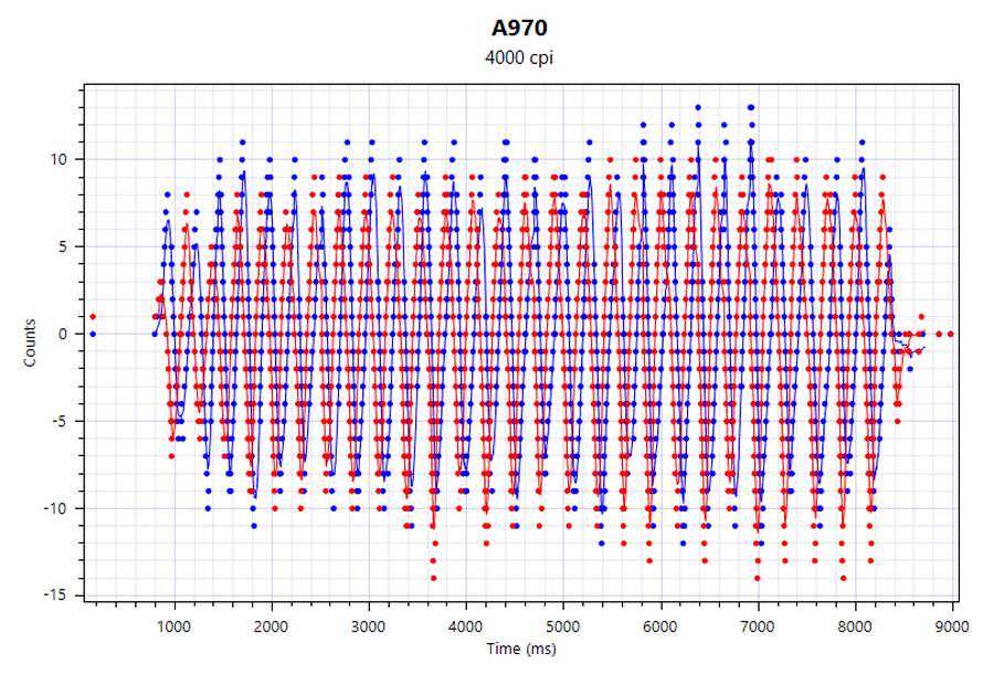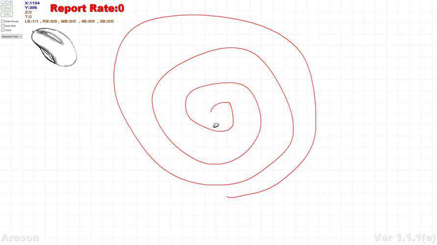 鼠标测试一般会采用蚊香图来查看鼠标轨迹的平滑度,在上图中我们可以清晰的看到在花蚊香图时,达尔优A970牛年特别版没有丢帧、抖动的情况出现。这也得益于其定制的AIM传感器。