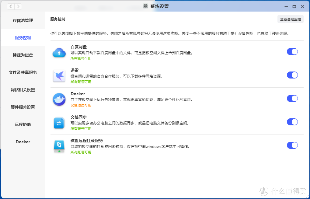 在服务控制选项中,可以看到极空间提供的一些额外的功能服务,用不到的功能可以手动关闭。