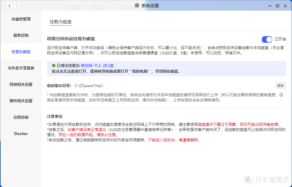 话说极空间ZOS在一些细节功能上做的真是不错,比如这里的“挂载为磁盘”功能,启用该功能后,可以自动将极空间挂载为本地硬盘分区,无论是局域网内还是网外都可以直接使用,对新手和小白用户来讲,真的非常实用。不用折腾什么异地组网、DDNS、SMB协议挂载之类,直接即点即用就完事儿了。