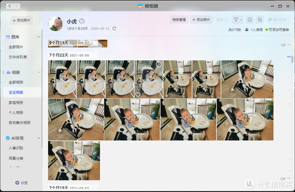 另外极相册的AI识别功能,可以智能进行人脸识别、场景识别等,配合人脸识别功能,还可以创建家庭相册和宝宝相册,通过设置家人的账号权限,既可以让家庭成员共同使用相册,又留有自己的隐私空间。