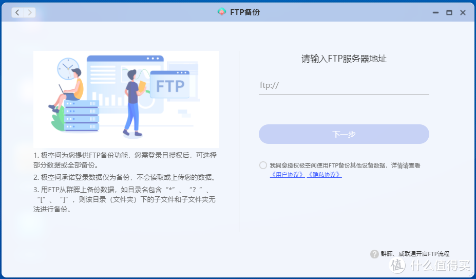 当然,FTP备份这个套件目前只是解决了有和无的问题,在功能性上还是不如群晖的HyperBackup、威联通的HBS3等软件,只能实现从旧NAS到极空间的单向导入,也只支持FTP协议,并且无法设置备份的计划任务。
