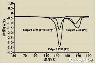 图3Celgard2730(PE)、Celgard2400(PP)、Celgard2325(PP/PE/PP)隔膜的DSC测试图