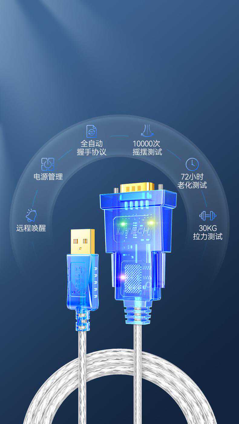 ⑩强悍性能,更多技术支持:全自动握手协议、10000次摇摆测试、电源管理、远程唤醒、72小时老化测试、30KG拉力测试。