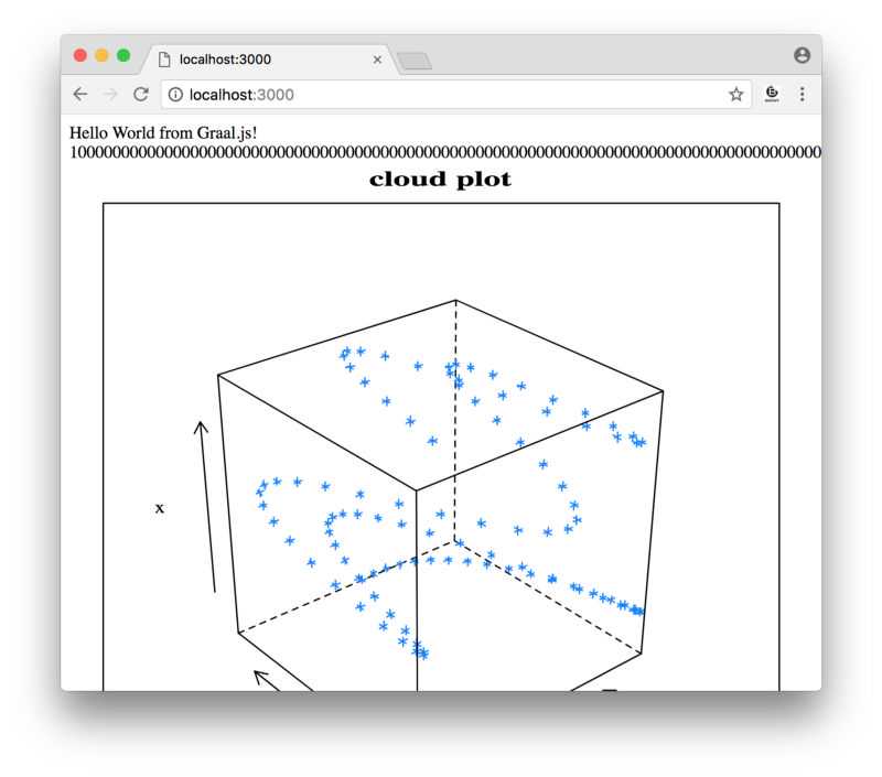 constexpress=require('express')constapp=expressconstBigInteger=('')('/',function(req,res){vartext='!br'//UsingJavastandardlibraryclassestext+=(10).pow(100).add((43)).toString+'br'//UsingRinteroperabilitytocreategraphstext+=('R',`svg;require(lattice);x-1:100y-sin(x/10)z-cos(x^1.3/(runif(1)*5+10))print(cloud(x~y*z,main="cloudplot"))grDevices:::`);(text)})(3000,function{('Exampleapplisteningonport3000!')})在浏览器中打开http://localhost:3000/查看结果。