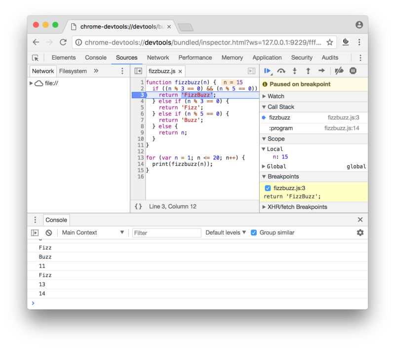 为了试验这个功能,我们开发了一个简单的FizzBuzz程序。它将内容输出到屏幕上,逻辑分支很清晰,只需要进行少量迭代,我们因此可以很容易地设置断点。我们先使用JavaScript来实现。
