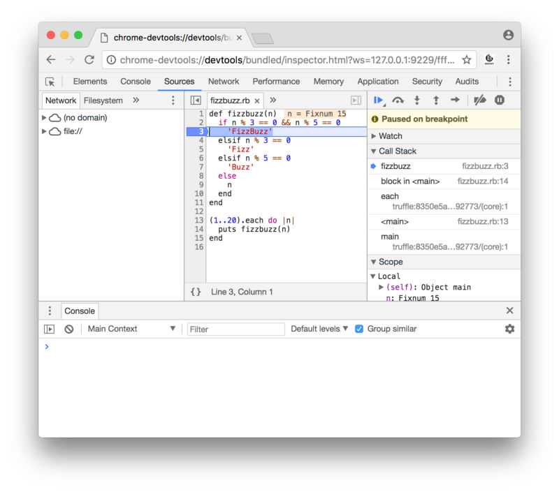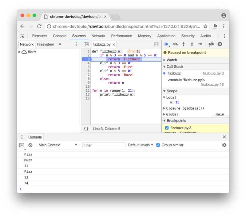 然后我们在FizzBuzz代码中设置一个断点,并继续执行。在跳过断点后,我们可以看到n的值,然后继续,或者查看调试接口的其余部分。