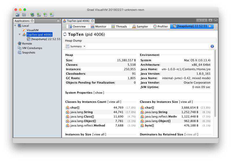 如果我们使用Ruby的GraalVM版本,VisualVM将会识别出Ruby对象。我们需要使--jvm选项来启动VisualVM,因为它不支持本地版本的Ruby。
