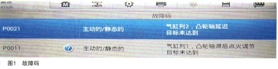一辆配置3.0TCJT发动机的2012年奥迪Q7。用户反映:该车发动机大修后,发动机运转平稳,水温正常,故障灯未点亮,但使用诊断仪读取故障码时,发动机控制模块里面有P0011、P0021故障码(如图1所示)。能顺利清除故障码,但发动机运行一段时间后故障码重现,反复几次都这样。说明故障真实存在。从故障码含义分析,故障指向气缸列1和列2的凸轮轴调节系统。