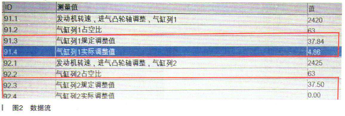 首先使用专用诊断仪的引导功能,选择91组和92组数据流。91组和92组数据,分别是气缸列1和气缸列2凸轮轴调节数据。第1项为发动机转速,第2项为控制凸轮轴电磁调节阀的占空比,第3项为凸轮轴调节的需求角度,第4项为凸轮轴调节的实际角度。路试车辆,查看第2-4项数据,当控制凸轮轴调节阀的占空比为63%时,气缸列1的需求调节角度为37.84°,而实际调节角度为4.86°,两者相差甚远;气缸列2更为严重,实际调整角度为0°,说明根本没有进行调节(如图2所示)。