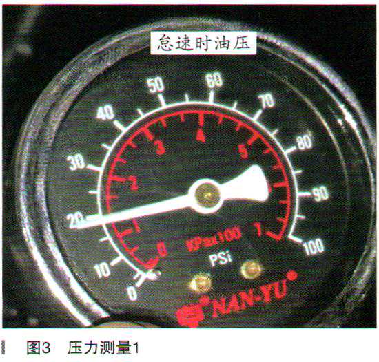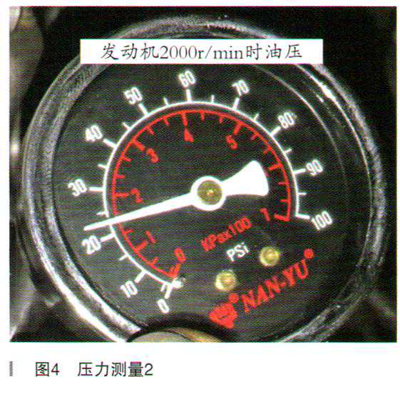 (3)测量机油油温在80℃时的机油压力,该车有高压压力开关F22和低压压力开关F378。在机油滤清器旁边找到机油高压压力开关F22、将机油压力表安装在F22的油孔上,等待机油油温达到80℃时读取机油压力值,怠速时机油压力为124kPa(18psi)左右(如图3所示),发动机转速在2000r/min时压力为158kPa(23psi)(如图4所示)。机油压力标准值怠速时至少为120kPa,发动机在2000r/min时压力至少为150kPa。测量的机油压力值在标准范围,说明机油压力也正常。