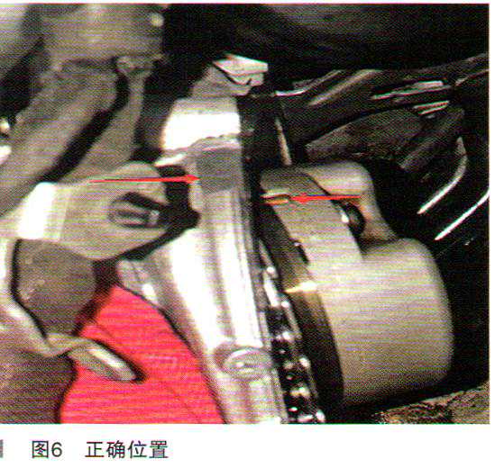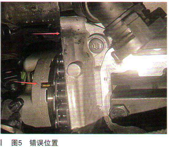 (4)拆开EGR阀、气门室盖、缸列1和缸列2后端盖,将专用正时工具按照要求固定好曲轴和凸轮轴后,发现两端的凸轮轴液压调节阀轮相对位置安装错误(如图5所示)。正确的安装位置是调节阀轮的凹槽在外壳平台(凸缘)范围内即可(如图6所示)。