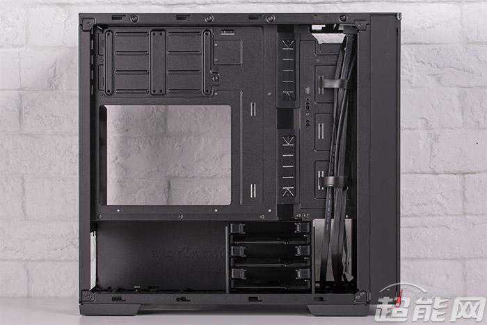 机箱背部其实留有较大空间给用户走线,而且前端还有一个凹位是专门留来做走线空间的,上面有两个魔术贴,方便用户整理背线,让机箱装机后显得更为整洁。