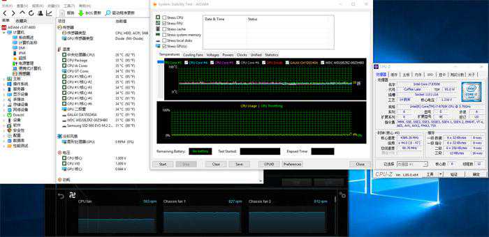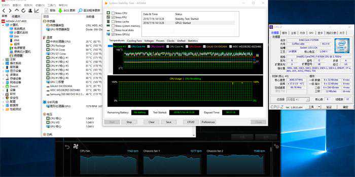 测试方法是用AIDA64同时对CPU和GPU进行烤机,由于用的是B360主板并没有太好的方法锁死烤机时的频率,大概半小时后CPU温度会在70℃到80℃之间波动,平均温度76.8℃,CPU风扇转速为1100到1200RPM,机箱前风扇转速为1300RPM,机箱后风扇转速为1550RPM,而显卡的GPU的平均温度为61.1℃,风扇转速为1600RPM,这样烤机的话其实还是有不少噪音。