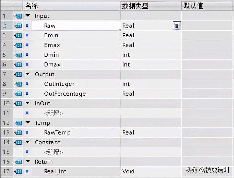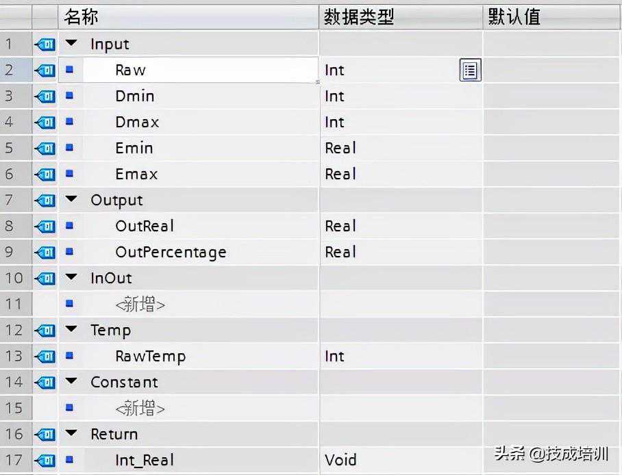 将整数的模拟量标定为实数的工程量,相当于博途中自带的SCALE_X,但该子程序结合高低量程限制后,标定和调试都更加方便。