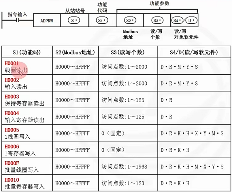 下图是MODBUS通讯ADPRW指令示例: