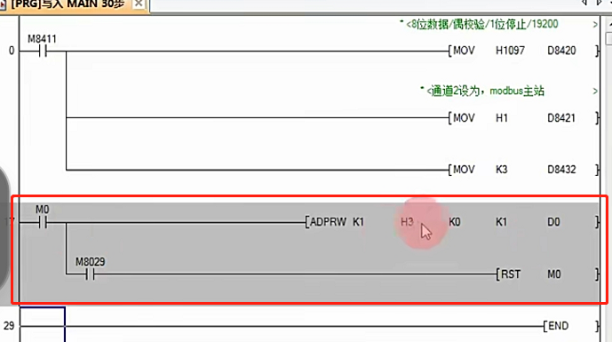 M8029:当ADPRW指令完成执行后,M8029=1,此时复位M0,以达到执行完毕后停止ADPRW指令读写的目的