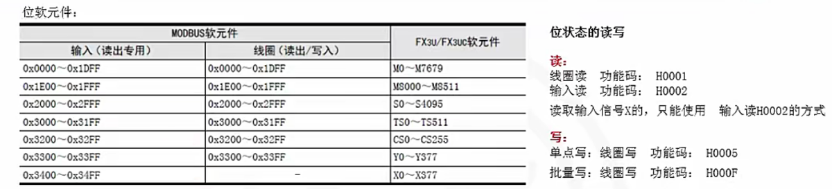 FX系列PLC的modbus地址可能略有不同,比方说FX3G就没有FX3U多,详情查看PLC对应的modbus通讯篇手册