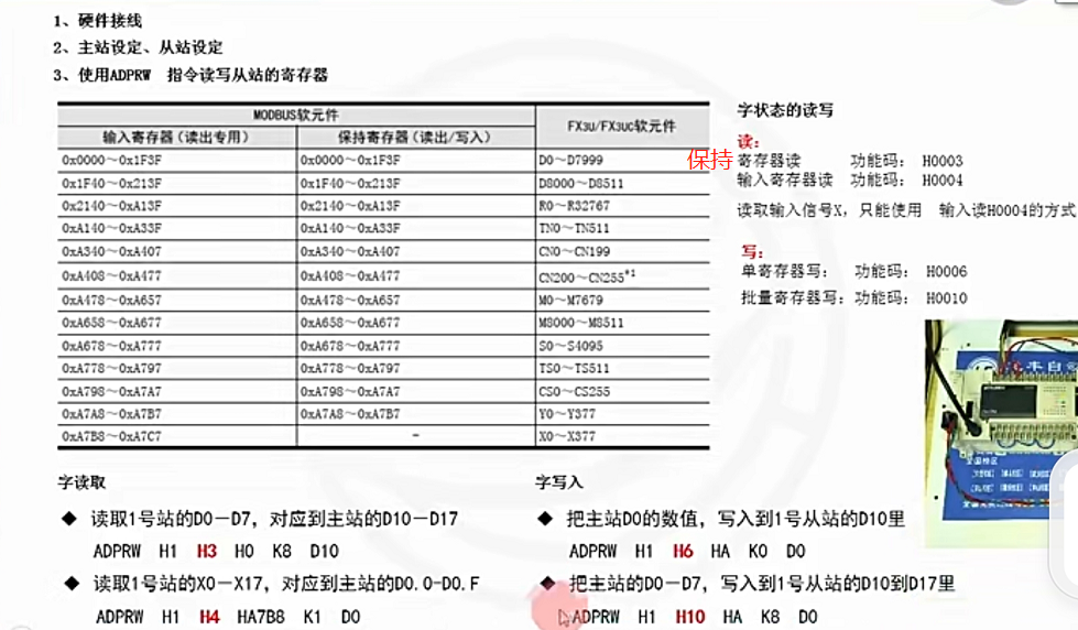 如下图,表述的是modbus地址对应的plc字软元件地址。当使用功能码H3时,modbus地址以右侧为准。当使用功能码H4时,modbus地址以左侧为准。