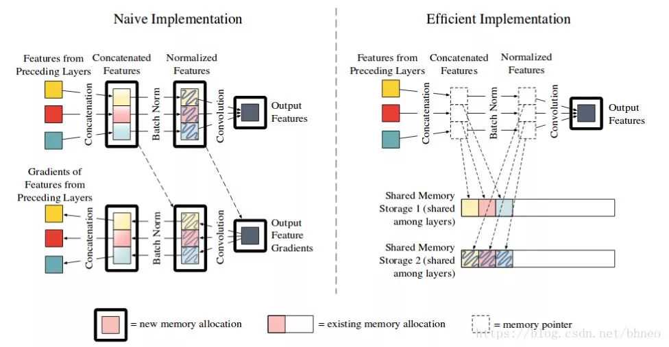 首先,拼接和批标准化操作不是时间密集型的。因此,我们可以在需要的时候重新计算这些值,而不是保存所有冗余内存。其次,我们可以使用“共享内存空间”来转储输出,而不是为输出分配“新”内存空间。