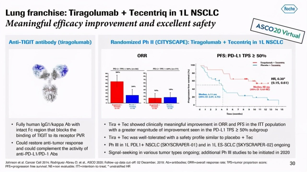当时,该药的Ⅱ期临床试验已然完成,从ASCO2020年会公布的数据看[5],即便作为PD-L1抗体T药的“配角”,TIGIT抗体还是“功不可没”的发挥了作用。在T药基础上,TIGIT抗体让中晚期非小细胞肺癌总缓解率再次上升了16个百分点,肺癌进展/死亡风险降低了42%!