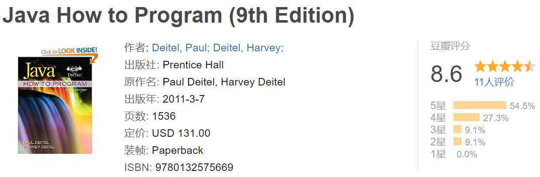 《Java编程思想(第4版)》豆瓣评分9.1,如果你更注重研究Java的细节,那这本书适合你,不过它并不适合作为入门书籍使用。