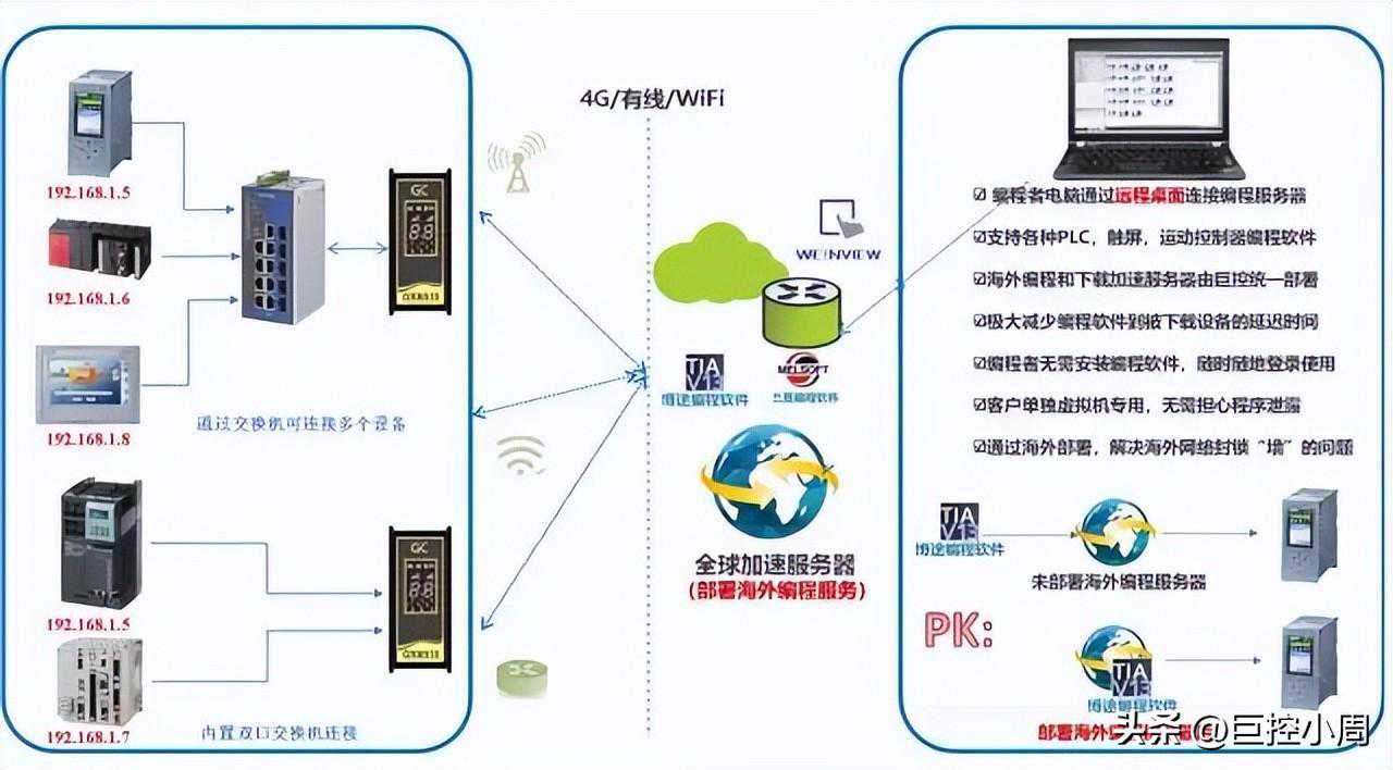 部署:编程调试人员在国内,设备在国外,中间搭建海外加速服务器和编程云服务器。直接拉近编程软件到远程PLC之间的距离。