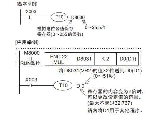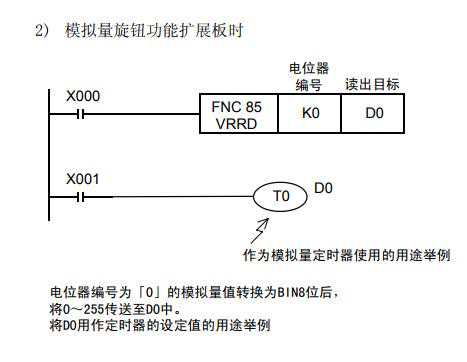 通过将作为数值读取的值指定为定时器的间接指定值,可以制作电位器式的模拟量定时器。为了将模拟电位器的值读入可编程控制器,需使用FNC85(VRRD)。