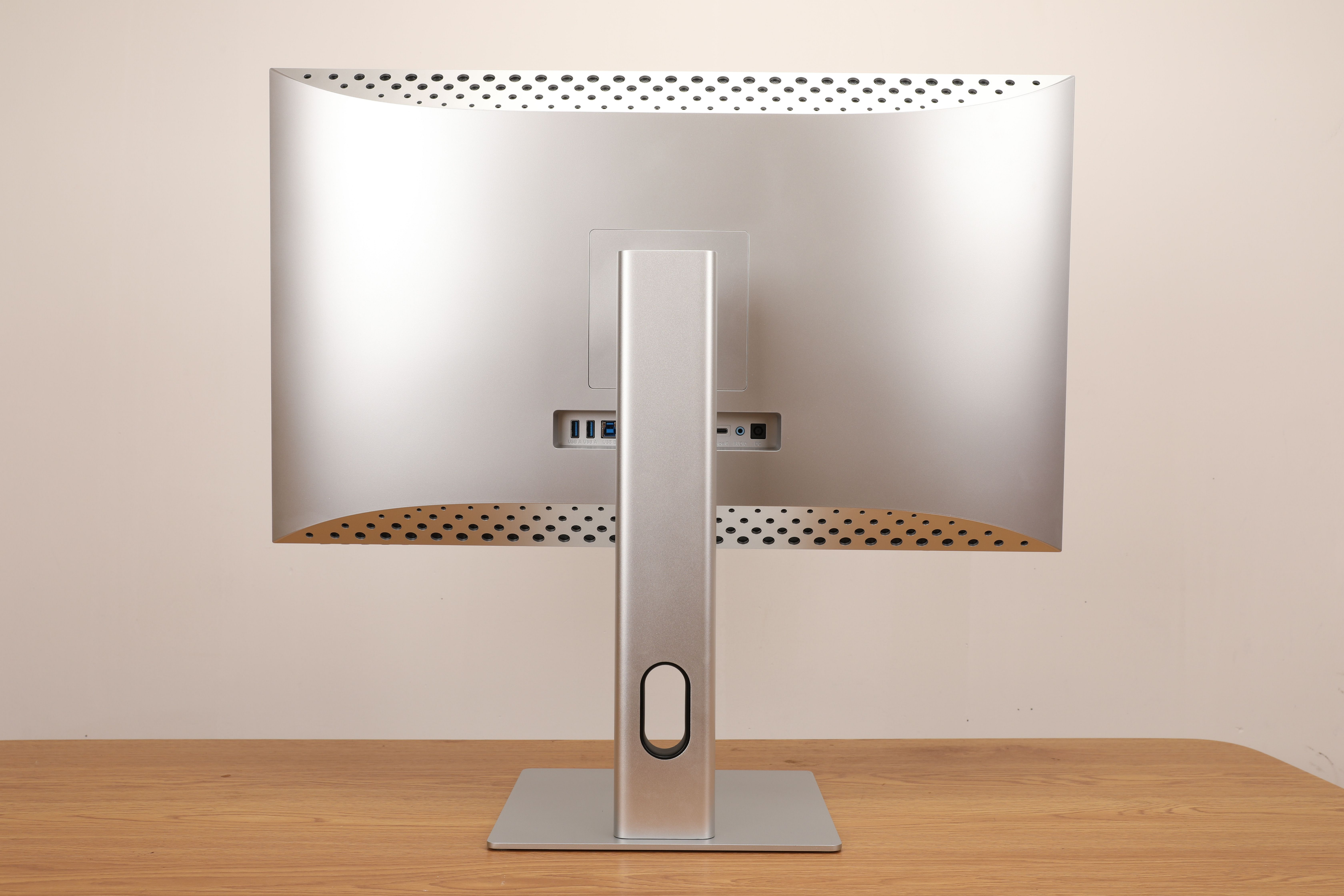 所有的接口都位于显示器背面,从左到右分别有2个接口,1个USB-B接口,1个Type-C接口,2个HDMI接口,1个DP接口,1个音频接口和电源线接口。