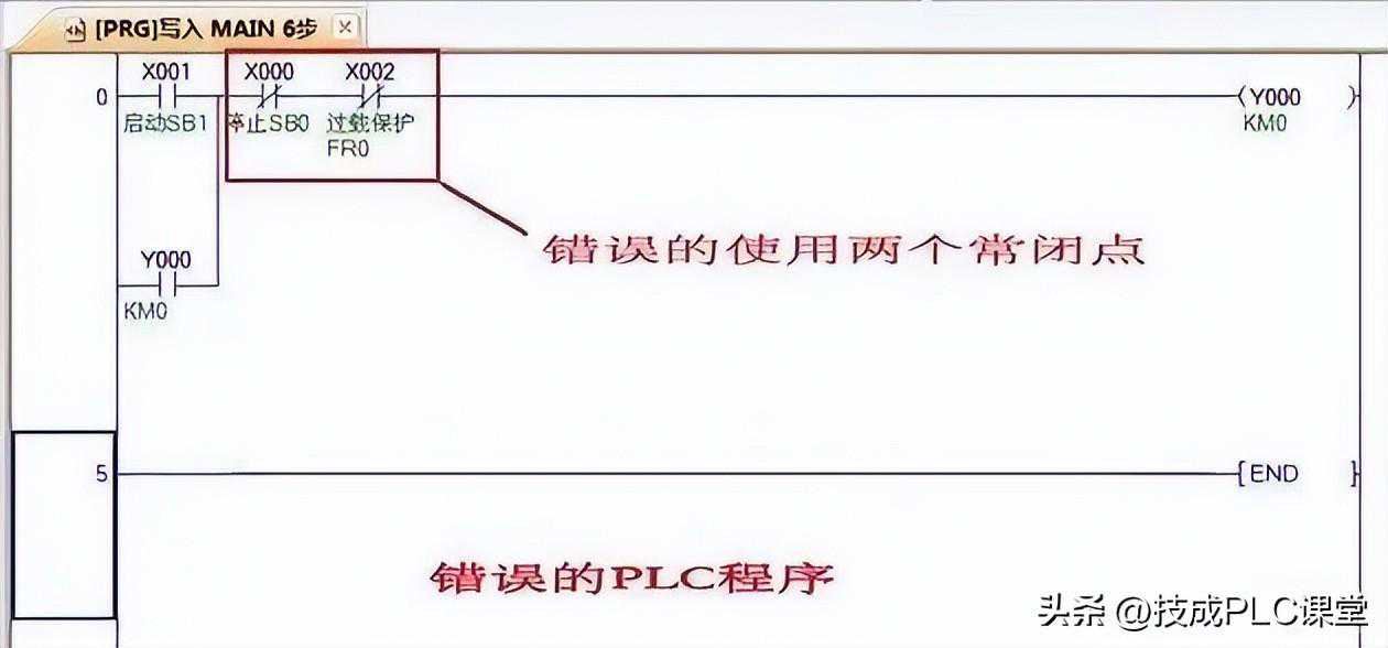 在编制PLC程序时,不管是新手还是老手,都会犯下面的这种低级错误。因为这种错误是非语法上的,所以用编程软件也不能检查出错误之处。此错误一旦发生,自己有时还很难发现,直至上机调试运行时,所控设备不能运行或运行到某个位置停止不前,才察觉出来有问题,再对PLC程序逐条逐句查找分析,或采取对程序逐条逐句执行,费时费工。