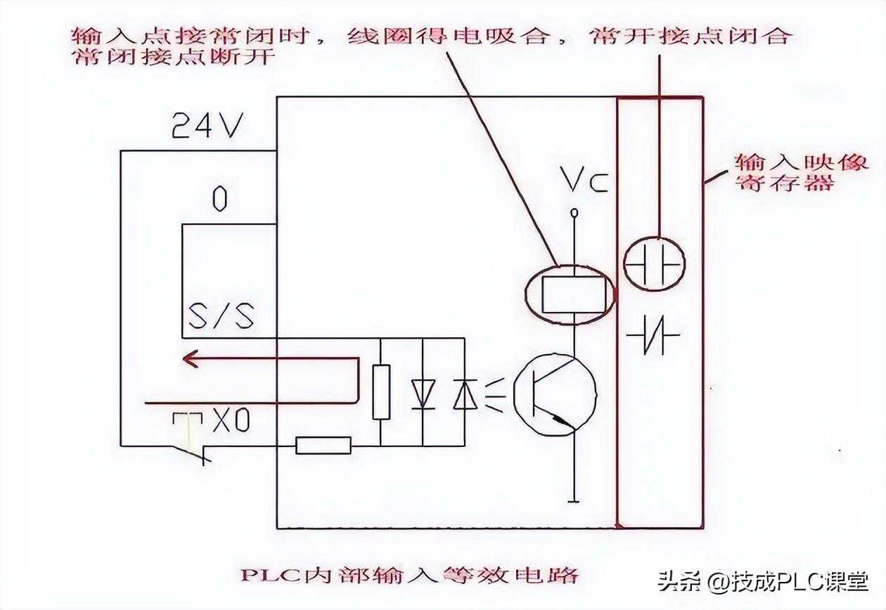 PLC上电后,X000、X002常闭点就会断开。即逻辑值为“0”Y0=(Y0+X001)×X000×X002从上面数字逻辑表达式可知,在按下启动按钮SB1后,X001的逻辑值为“1”,而Y0的逻辑值永远不会变化,始终为“0”。原因是与PLC内部输入电路有关,以下是PLC内部输入等效电路: