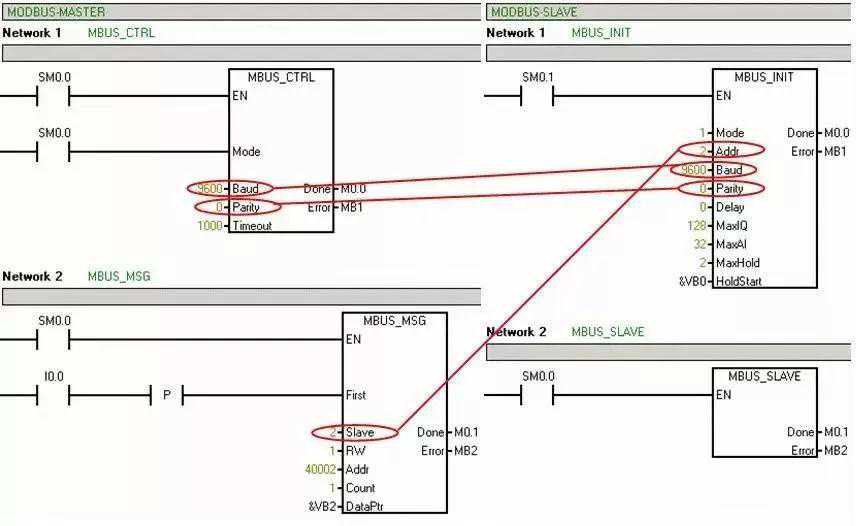 对于MODBUS通讯,主站侧需要程序库"MBUS_CTRL"和"MBUS_MSG",从站侧需要程序库"MBUS_INIT"and"MBUS_SLAVE"。